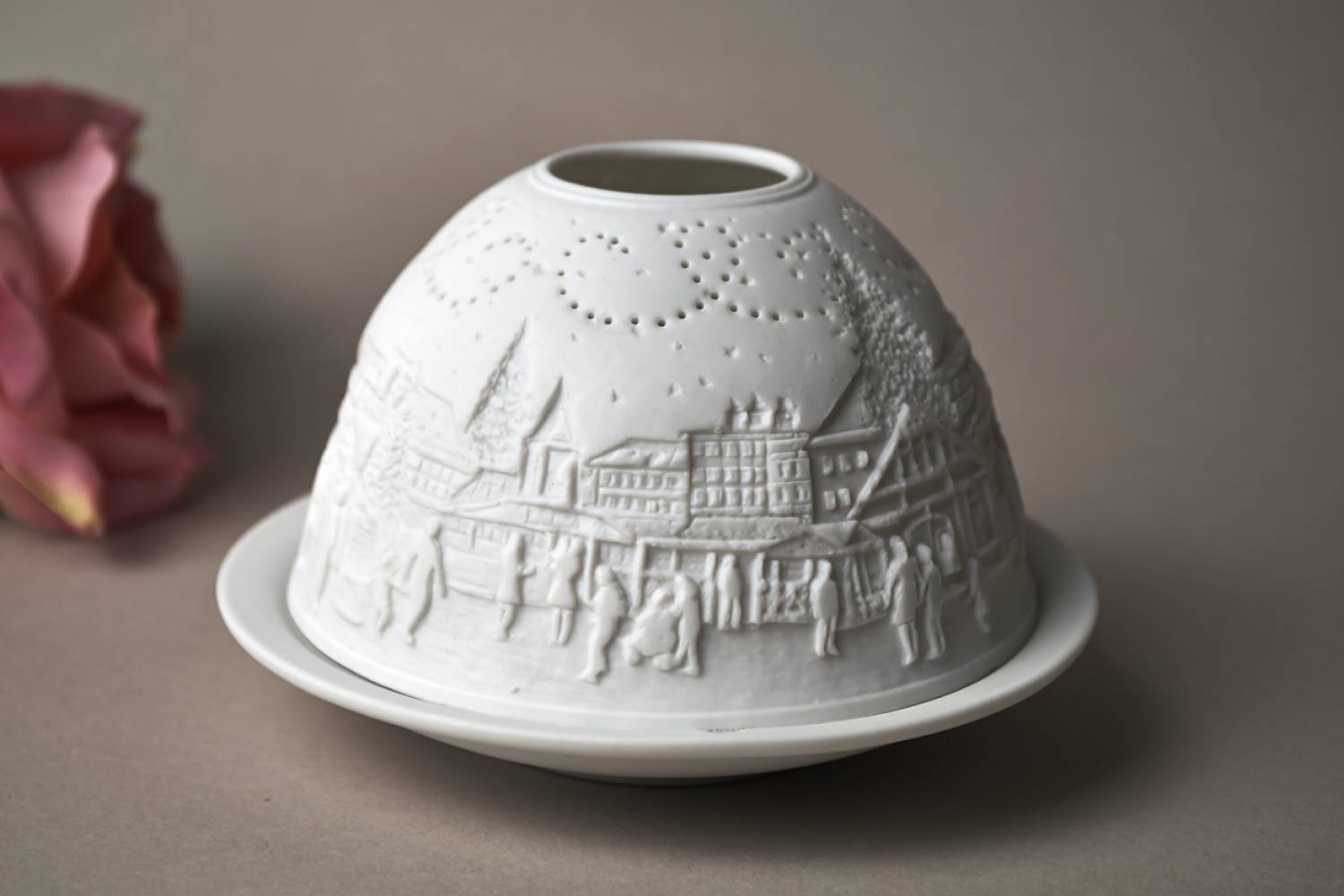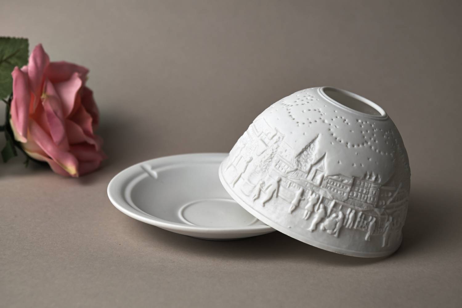 Der Besuch auf einem Weihnachtsmarkt lohnt sich immer. Dieser Teelichthalter aus Bisquitporzellan zeigt einen kleinen Weihnachtsmarkt und verführt zu einem Besuch.