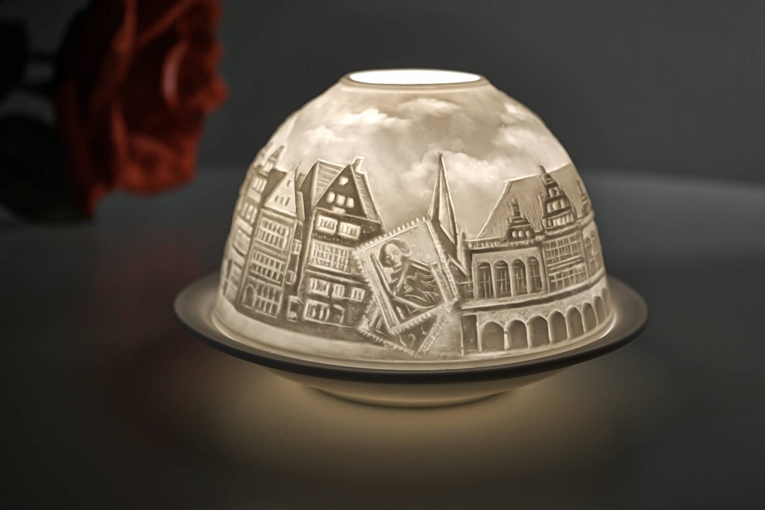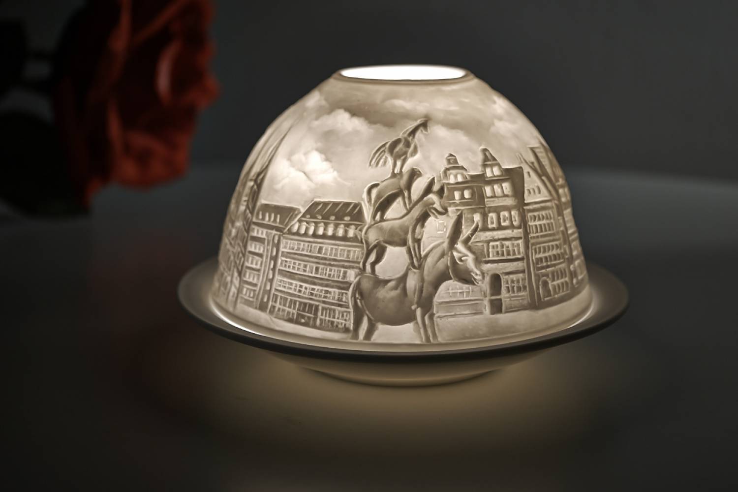 Die Bremer Stadtmusikanten - Dieser Teelichthalter aus Bisquitporzellan zeigt Motive für die Bremen bekannt ist.