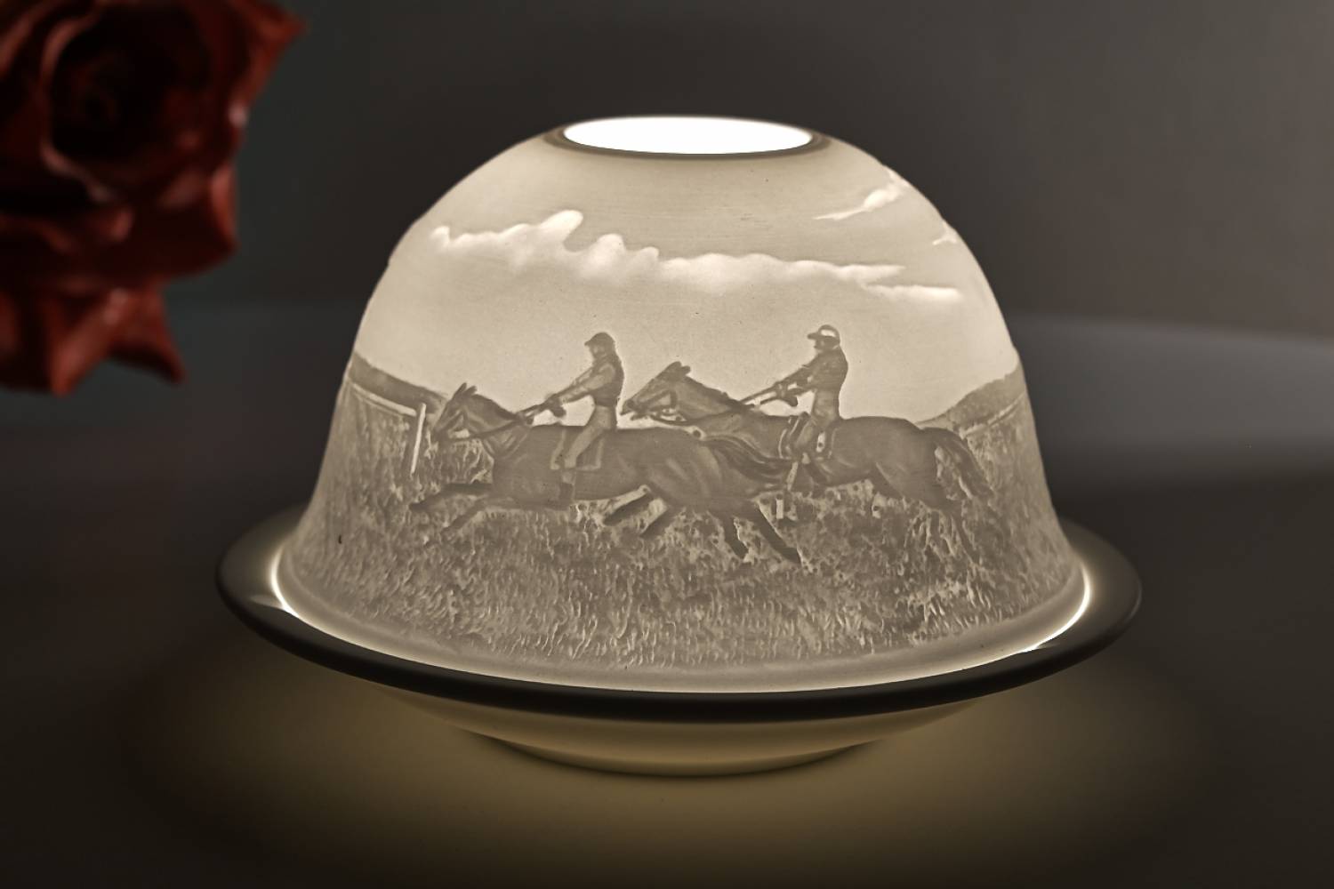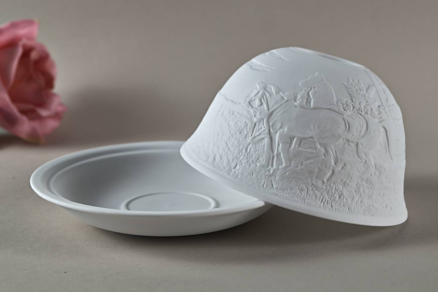 Dieser Teelichthalter aus Bisquitporzellan zeigt Pferde auf der Weide.