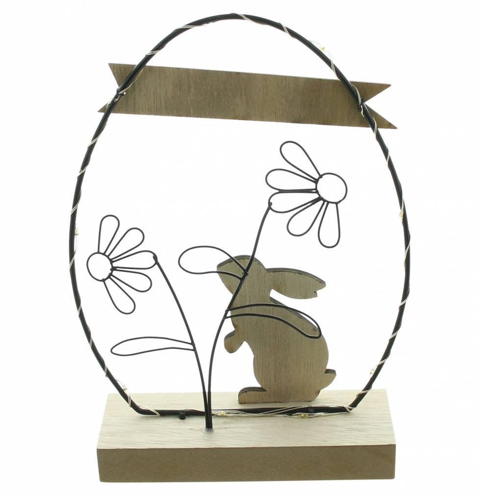 Sie erhalten eine tolle Leuchtdeko aus schwarz lackiertem Metall auf einem Holzsockel. Das Ei wird mit 8 warmweissen LEDs beleuchtet und vom Osterhasen bestaunt.