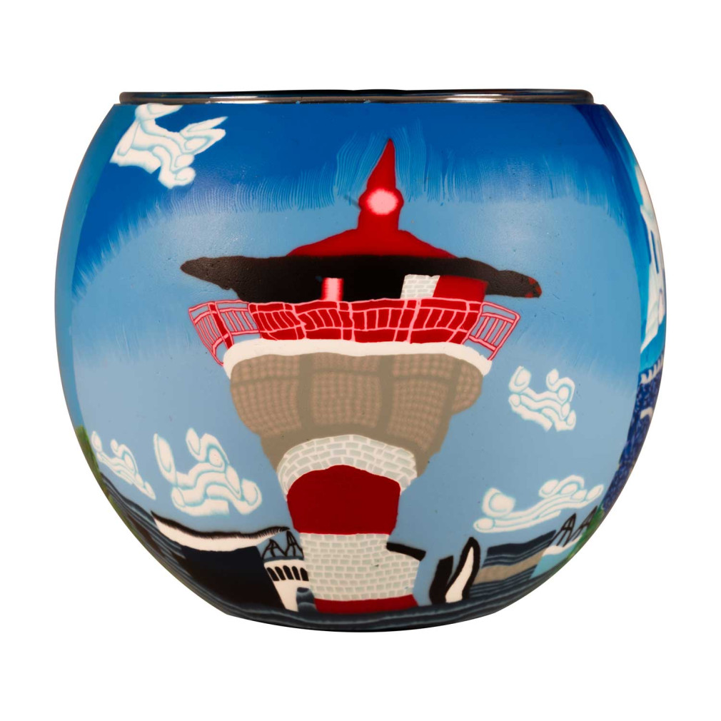 Sobald du ein Teelicht entzündest, entfaltet das Glas seinen vollen Zauber: Die Farben beginnen sanft zu leuchten, und das maritime Motiv erinnert an lange Spaziergänge am Meer, Wellenrauschen und Leuchttürme in der Abenddämmerung.