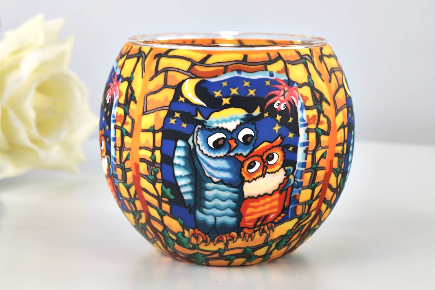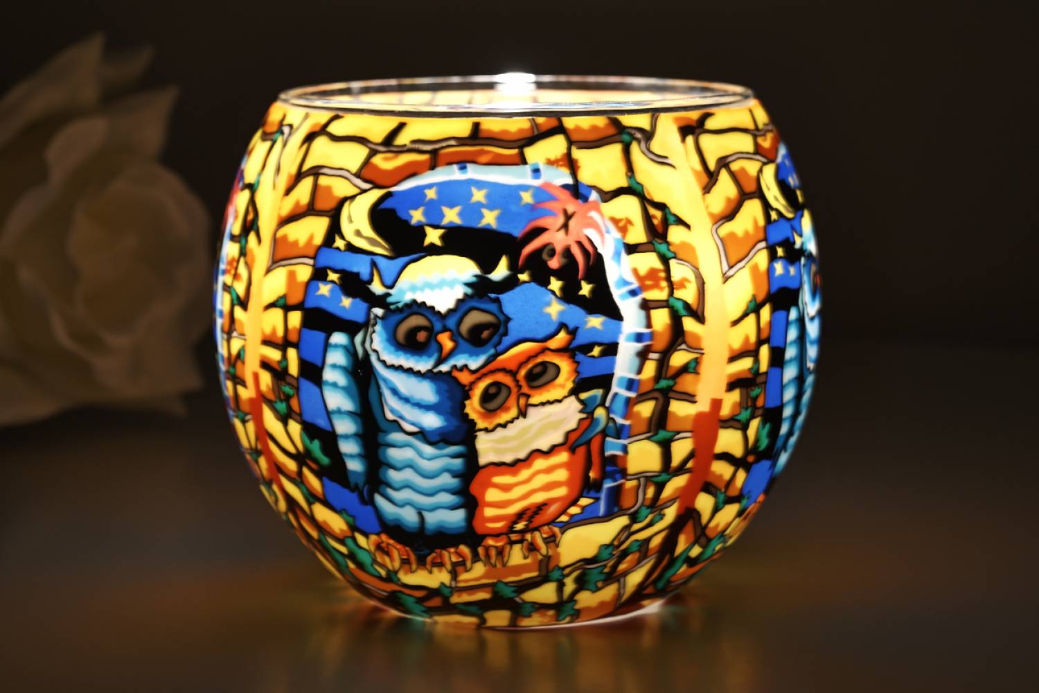 Bei Kerzenschein entfaltet das Glas ein besonders stimmungsvolles Lichtspiel – die Eulen, der Mond und die Sterne beginnen förmlich zu leuchten und schaffen eine ruhige, gemütliche Atmosphäre.