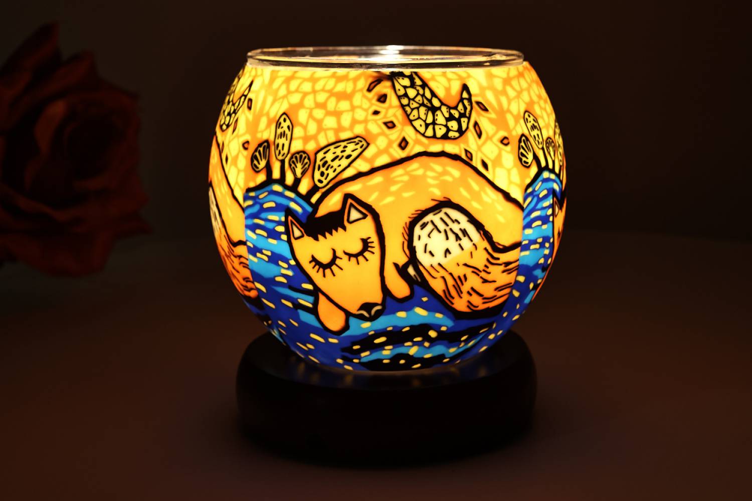 Mit seinen charakteristischen Farbflächen, dem freundlichen Fuchs-Motiv und dem warmen Licht eignet sich dieses Stück perfekt als Geschenk, Blickfang im Wohnzimmer, Nachtlicht oder dekorative Akzentbeleuchtung.