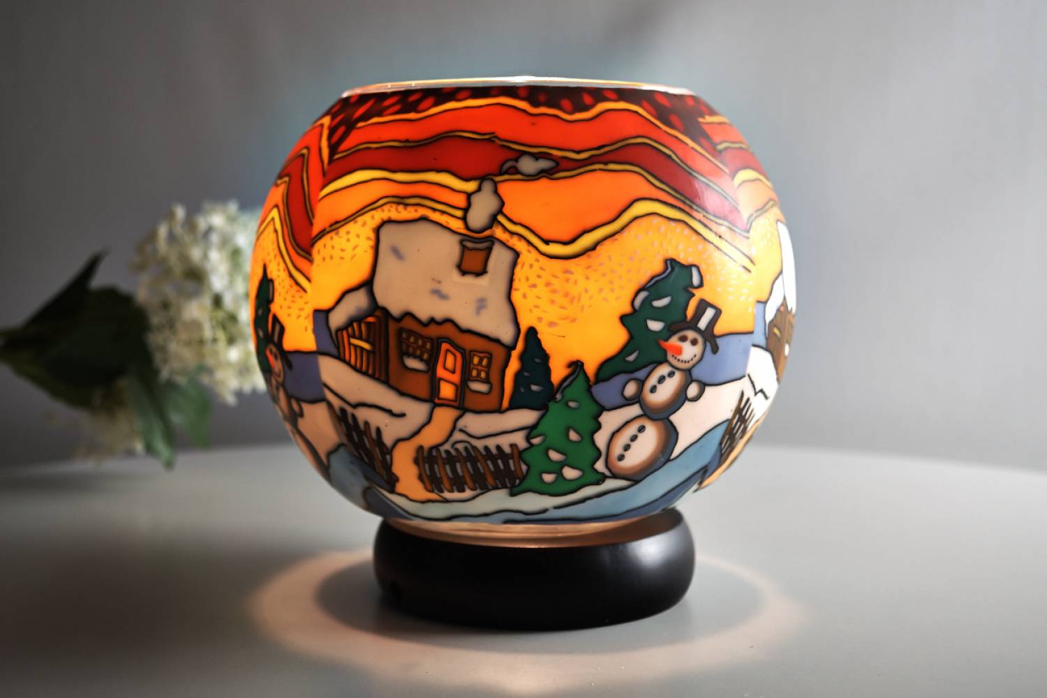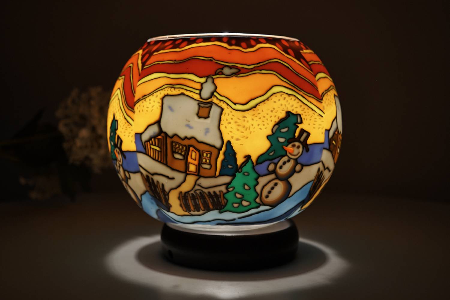 Bitte beachten Sie, dass die Leuchtgläser beim Fotografieren zur besseren Erkennung der Motive mit einer elektrischen LED-Lampe 1,4W beleuchtet wurden. Beleuchten Sie das Leuchtglas mit einem Teelicht, ist dieses nicht so hell, wirkt dafür lebendiger und verbreitet eine gemütliche Atmosphäre.