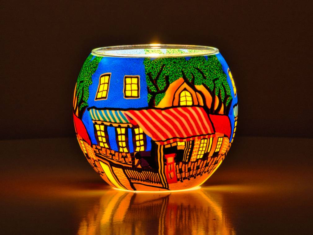 Bei Kerzenschein leuchten die Farbtöne besonders sanft und schaffen eine gemütliche, mediterrane Atmosphäre. Das Glas eignet sich ideal für Wohn- und Essbereiche, Küchen, Balkone oder als kleines dekoratives Highlight im Alltag.