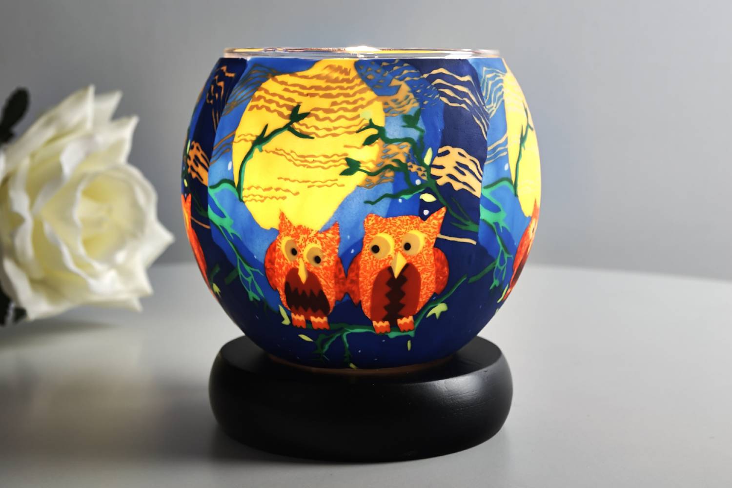 Der Sockel verfügt über eine elektrische Fassung, sodass das Leuchtglas elektrisch beleuchtet werden kann. Mit dem Kerzenlicht-Effekt entsteht ein warmes, stimmungsvolles Licht, das die Farben der Eulen lebendig zur Geltung bringt.