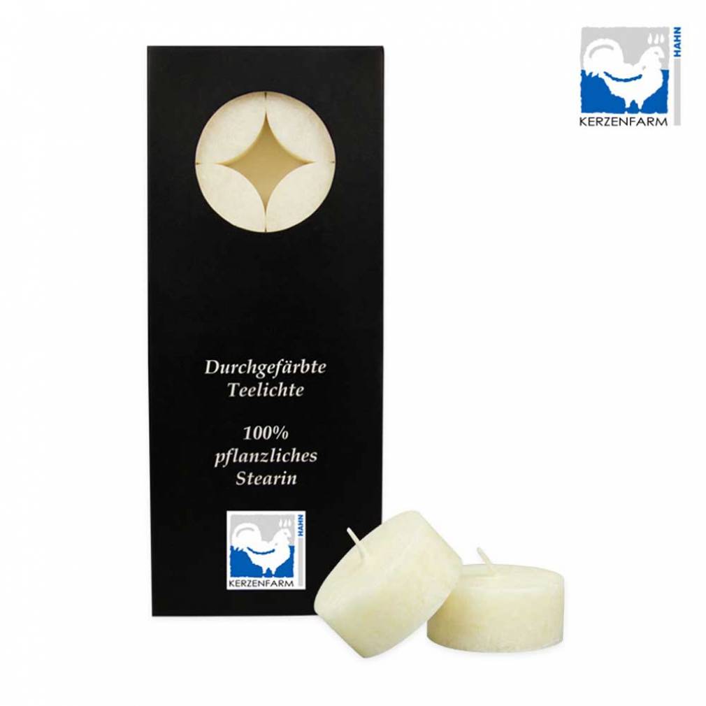 Stearin-Teelichter von Kerzenfarm Hahn in tollen Farben und eleganter schwarzen Geschenkpackung aus 100% pflanzlichen Stearin.